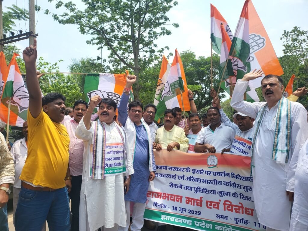 रांची: झारखंड प्रदेश कांग्रेस कमिटी के तत्वावधान में अखिल भारतीय कांग्रेस कमिटी के पूर्व अध्यक्ष राहुल गॉंधी को पक्षपातपूर्ण रवैया अपनाते हुए पूर्वाग्रह से केवल बदला लेने एवं राजनैतिक प्रतिशोध की भावना रखते हुए केन्द्र सरकार के निर्देश पर प्रवर्तन निदेशालय ई डी द्वारा उनकी छवि को धूमिल करने के लिए परेशान किये जाने के विरोध में एवं मौजूदा भाजपा सरकार में केंद्रीय एजेंसी के राजनीतिक दुरुपयोग के खिलाफ राष्ट्रव्यापी कार्यक्रम के तहत प्रदेश अध्यक्ष राजेश ठाकुर के नेतृत्व में स्थानीय मोरहाबादी स्थित बापू वाटिका मोरहाबादी, रॉंची से राजभवन तक मार्च किया गया।