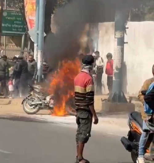 राँची के रातू रोड फ्लाईओवर में ओटीसी ग्राउंड के पास एक बाइक में लगी आग