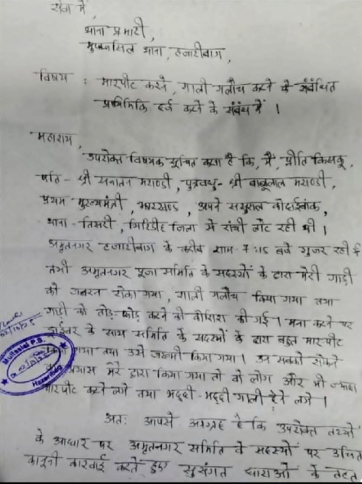 बुधवार को प्रीति किस्को अपने ससुराल से रांची लौट रही थीं। उनकी गाड़ी अमृत नगर पूजा पंडाल के पास जुलूस में फँस गई। ड्राइवर ने लोगों से रास्ता देने का अनुरोध किया, लेकिन बात विवाद में बदल गई। आरोप है कि कुछ लोगों ने गाड़ी रोककर ड्राइवर पर हमला कर दिया और उसे बुरी तरह घायल कर दिया।