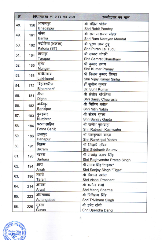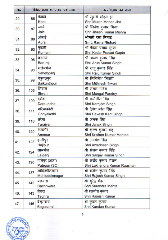बीजेपी ने बेतिया से पूर्व डिप्टी सीएम रेणु देवी, जमुई से श्रेयसी सिंह, रक्सौल से प्रमोद कुमार और सीतामढ़ी से सुनील कुमार पिंटू को चुनावी मैदान मेमं उतारा है। लखीसराय से डिप्टी सीएम विजय कुमार सिन्हा, रीगा से बैद्यनाथ, मधुबन से राणा रंधीर, बथनाह से अनिल कुमार, बेनीपट्टी से विनोद नारायण झा और अरवल से मनोज शर्मा को कमल के फूल का चुनाव चिन्ह मिला है।