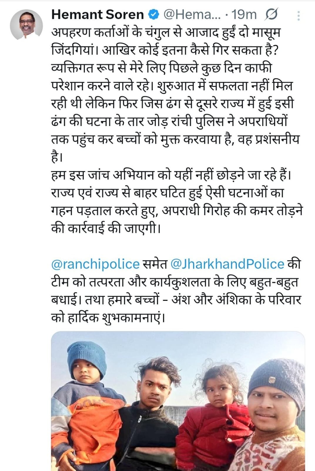 अपने संदेश में मुख्यमंत्री ने @ranchipolice और @JharkhandPolice की टीम को उनकी तत्परता, कार्यकुशलता और समर्पण के लिए बहुत-बहुत बधाई दी। साथ ही उन्होंने हमारे बच्चों अंश और अंशिका के परिवार को हार्दिक शुभकामनाएं देते हुए कहा कि पूरा झारखंड उनके साथ खड़ा है।