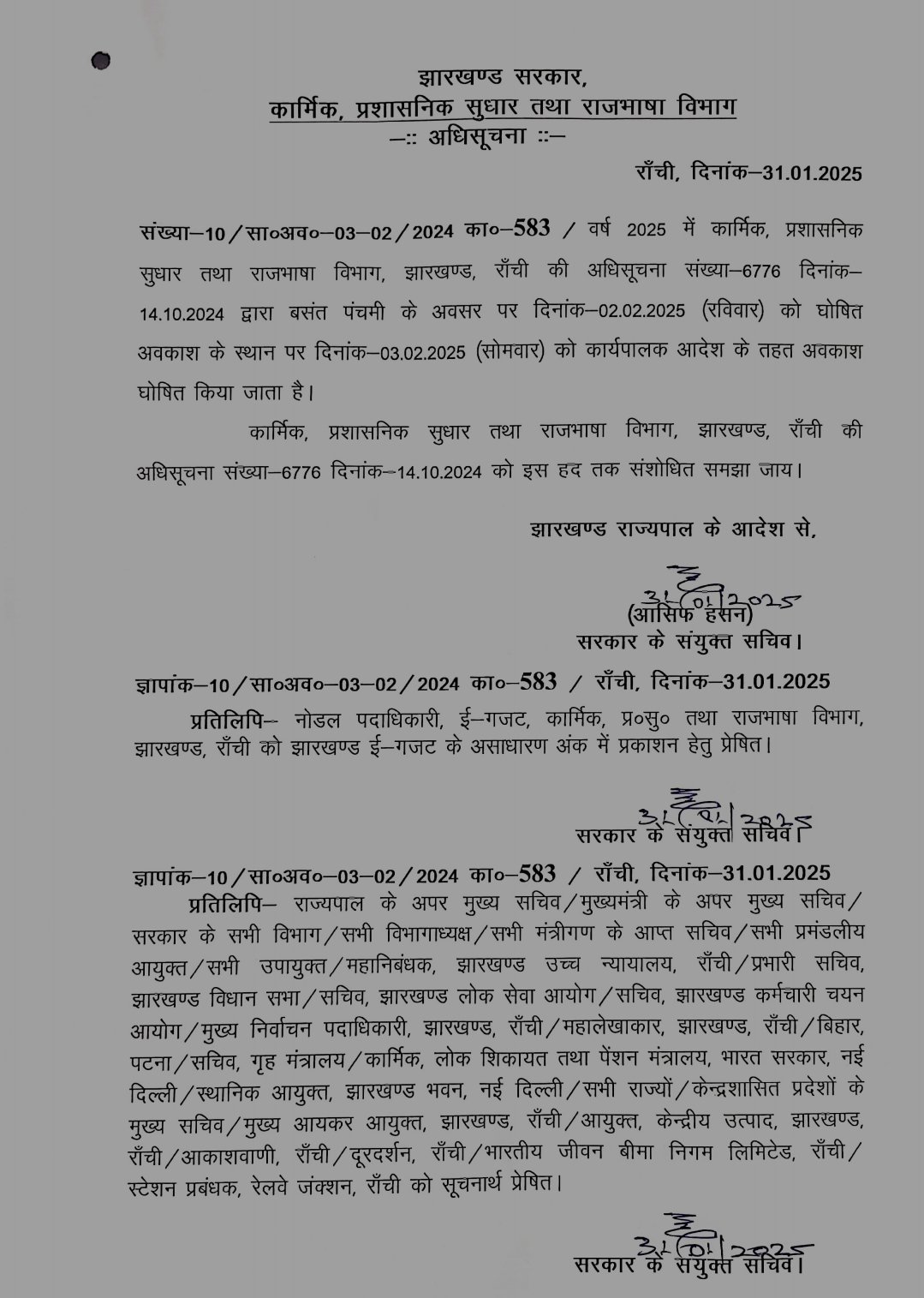 Home»Breaking News»झारखंड में बसंत पंचमी की 3 फरवरी को रहेगी सरकारी छुट्टी, अधिसूचना जारी