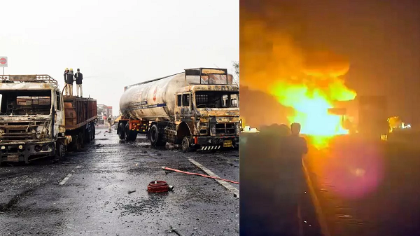 जयपुर जिले के दूदू क्षेत्र में मौखमपुरा के पास मंगलवार रात एक खौफनाक हादसा हुआ। एलपीजी सिलेंडरों से भरे खड़े ट्रक को एक केमिकल टैंकर ने जोरदार टक्कर मार दी। टक्कर लगते ही टैंकर के केबिन में आग लग गई, जो तेजी से ट्रक तक फैल गई। आग सिलेंडरों तक पहुंची तो एक के बाद एक करीब 200 गैस सिलेंडरों में विस्फोट हो गया। धमाकों की आवाज 10 किलोमीटर दूर तक सुनाई दी और कुछ सिलेंडर 500 मीटर दूर खेतों तक जा गिरे। घटना रात करीब 10 बजे हुई, जिससे हाईवे पर अफरा-तफरी मच गई। प्रत्यक्षदर्शियों के अनुसार, टैंकर चालक ने आरटीओ वाहन को देखकर अचानक ढाबे की ओर मोड़ काटी और सामने खड़े गैस सिलेंडर से लदे ट्रक से भिड़ गया। हादसे में टैंकर का चालक जिंदा जल गया। वहीं, आसपास खड़े पांच अन्य वाहन भी आग की चपेट में आ गए। दमकल की 12 गाड़ियों ने करीब 3 घंटे की मशक्कत के बाद आग पर काबू पाया। ट्रक में कुल 330 सिलेंडर लदे हुए थे, जिनमें से दो तिहाई से ज्यादा सिलेंडर फट गए। हाईवे पर दोनों ओर ट्रैफिक रोकना पड़ा, जिसे बुधवार सुबह करीब 4:30 बजे दोबारा खोला गया।एक दर्दनाक हादसे में केमिकल से भरा टैंकर सिलेंडर लदे ट्रक से टकरा गया, जिससे भयंकर आग लग गई। ट्रक ड्राइवर शाहरुख ने बताया कि हादसे में उसका ट्रक पूरी तरह जलकर खाक हो गया। घटना के समय टैंकर जयपुर की ओर जा रहा था, तभी सामने से आरटीओ की गाड़ी आती दिखी। आरटीओ वाहन को देखकर टैंकर चालक घबरा गया और खुद को बचाने की कोशिश में उसने टैंकर को सड़क किनारे एक ढाबे में घुसा दिया।