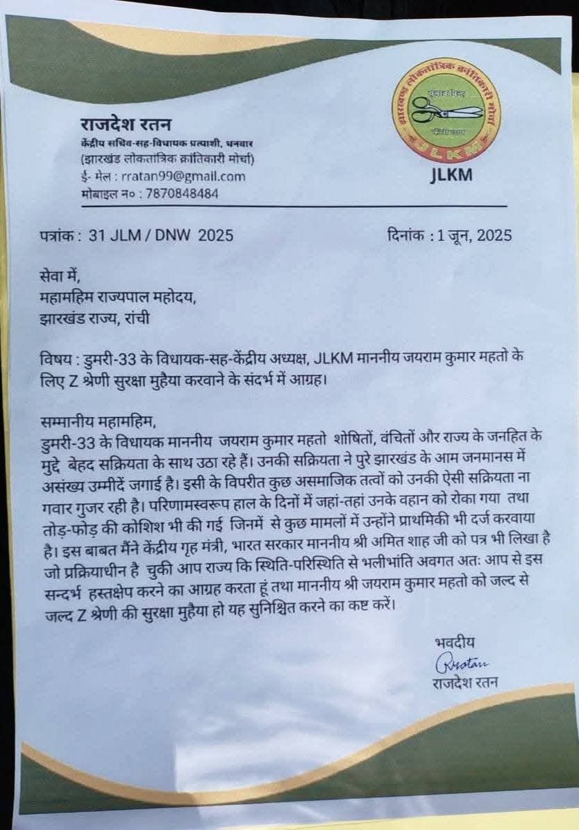 राजदेश रतन ने पत्र में जानकारी दी कि उन्होंने दो महीने पहले केंद्रीय गृह मंत्री अमित शाह को भी पत्र लिखकर जयराम महतो के लिए Z श्रेणी की सुरक्षा की सिफारिश की थी. लेकिन अब तक कोई पहल नहीं की गयी है.