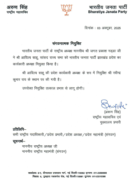 झारखंड बीजेपी का नया सियासी कदम: आदित्य साहू बने कार्यकारी अध्यक्ष, रवींद्र कुमार राय को हटाया