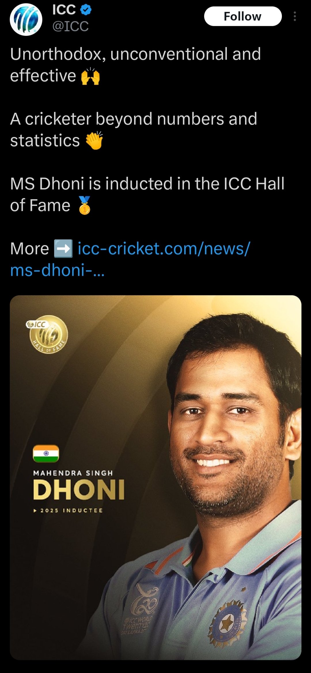 धोनी भारत के 11वें खिलाड़ी हैं जिन्हें आईसीसी हॉल ऑफ फेम में शामिल किया गया है। उनसे पहले नीतू डेविड, वीरेंद्र सहवाग, डियान एडुल्जी, विनोद मांकड़, सचिन तेंदुलकर, राहुल द्रविड़, अनिल कुंबले, कपिल देव, बिशन सिंह बेदी और सुनील गावस्कर को यह सम्मान मिल चुका है। गावस्कर और बिशन सिंह बेदी भारत से आईसीसी हॉल ऑफ फेम में शामिल होने वाले सबसे उम्रदराज खिलाड़ी हैं। उन्हें यह सम्मान 2009 में मिला था।
