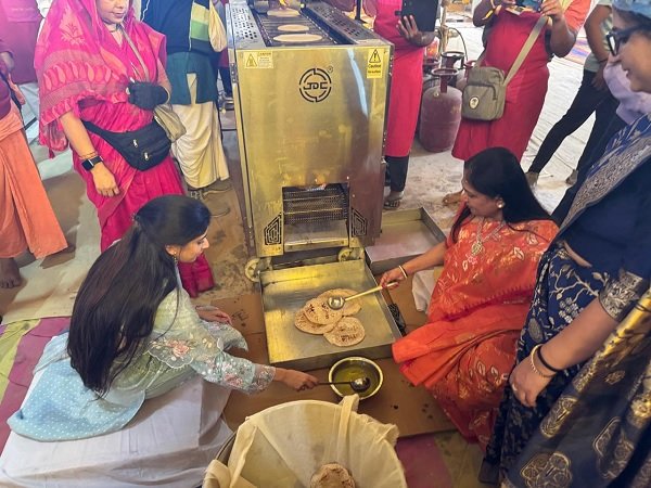 इसके बाद डॉ. प्रीति अदाणी अपनी बहु के साथ उस जगह पर पहुंचीं जहां पर रोटी बनाने का काम चल रहा था। वहां पहुंचते ही सास-बहू की जोड़ी जमीन पर बैठ गई और रोटियों पर घी लगाने का काम करने लगी। रोटी मेकिंग मशीन से रोटी बन कर जैसे ही बाहर आती डॉ. प्रीति अदाणी और परिधि अदाणी फौरन उन रोटियों में घी लगा कर श्रृद्धालों को परोसने के लिए आगे बढ़ा देते।