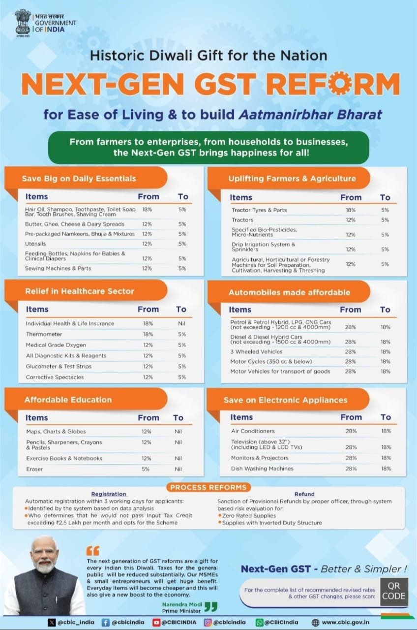 सरकार ने देश के आम आदमी को प्री-दिवाली गिफ्ट दे दिया है. बुधवार को नई दिल्ली में हुई जीएसटी काउंसिल की 56वीं बैठक में कई बड़े फैसले लिए गए हैं. इसके तहत टैक्स स्लैब को कम किया गया, जिससे तमाम सामानों पर लगने वाले टैक्स का रेट कम हो जाएगा. नए रेट 22 सितंबर 2025 से लागू होंगे. नए जीएसटी सुधार के तहत 100 से ज्यादा चीजों के दाम घटने वाले हैं. इसमें जरूरी वस्तुओं, रोजमर्रा की चीजों, एग्रीकल्चर प्रोडक्ट्स और हेल्थ प्रोडक्ट्स पर टैक्स रेट में कमी की गई है.