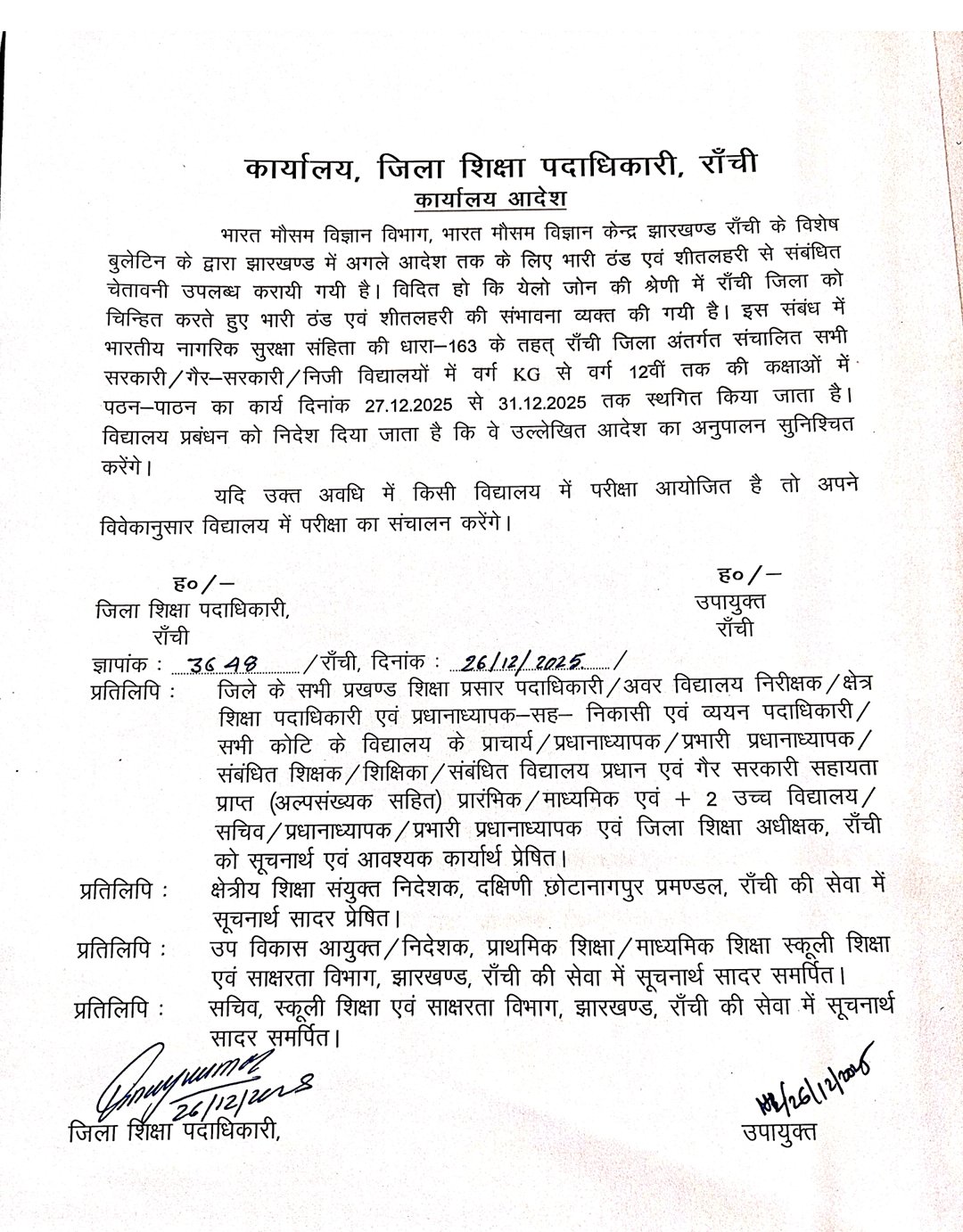 मौसम विभाग ने रांची को येलो श्रेणी में रखते हुए आने वाले दिनों में भारी ठंड और शीतलहर की स्थिति बनने की संभावना जताई है। न्यूनतम तापमान लगातार नीचे जा रहा है, जिससे बच्चों और बुजुर्गों के स्वास्थ्य पर प्रभाव पड़ने का खतरा बढ़ गया है। इसी को देखते हुए यह एहतियाती कदम उठाया गया है।