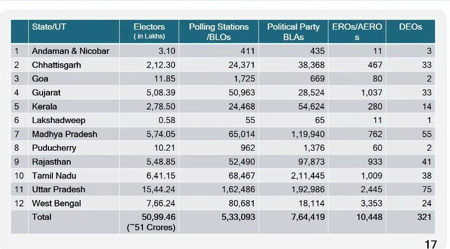 विशेष गहन पुनरीक्षण (SIR) का दूसरा चरण 12 राज्यों/केंद्र शासित प्रदेशों में होगा. इन 12 राज्यों में पश्चिम बंगाल, तमिलनाडु, उत्तर प्रदेश, राजस्थान, पुडुचेरी, मध्य प्रदेश, लक्षद्वीप, केरल, गुजरात, गोवा, छत्तीसगढ़ और अंडमान एवं निकोबार शामिल हैं.